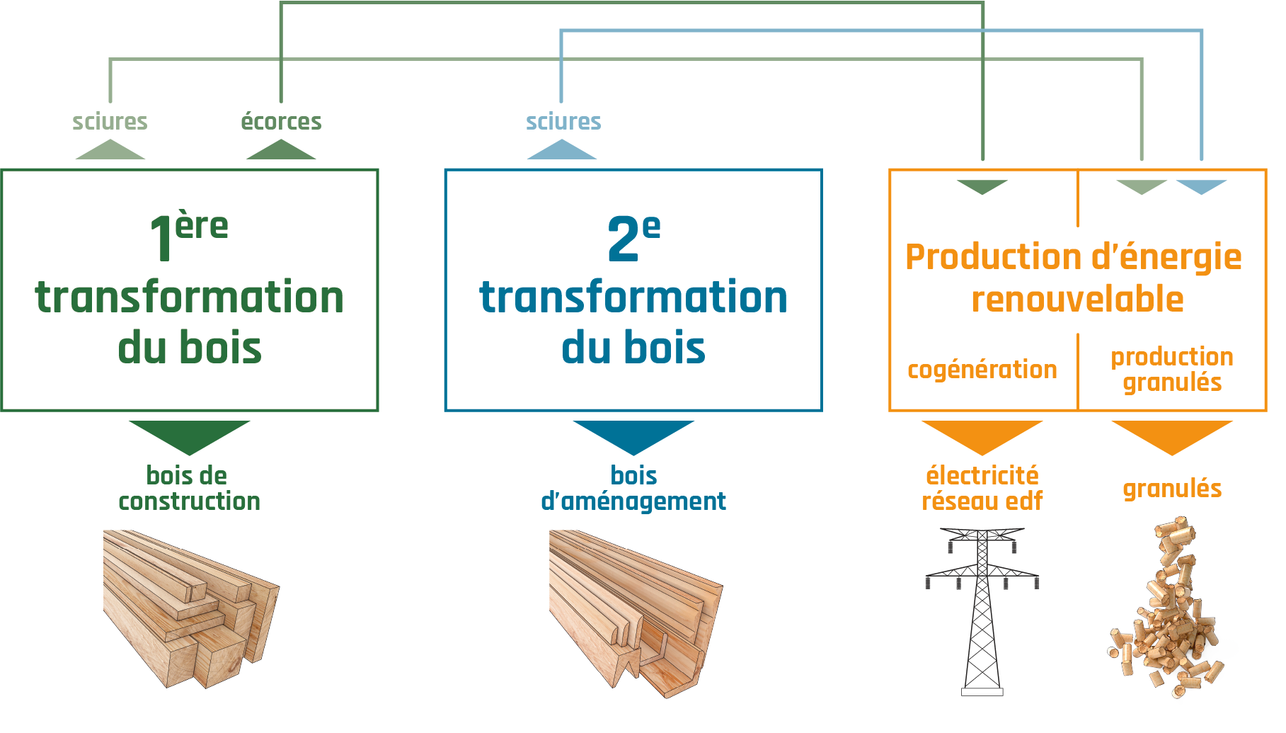 At the backbone of its business model, Groupe SIAT early decided that all raw material would be transformed on site. Throughout the product manufacturing process, bark and sawdust are recovered for valorisation. The bark feeds the cogeneration and will generate green electricity. The sawdust is dried, compressed, and valorised as pellets.